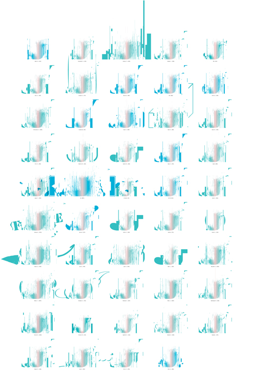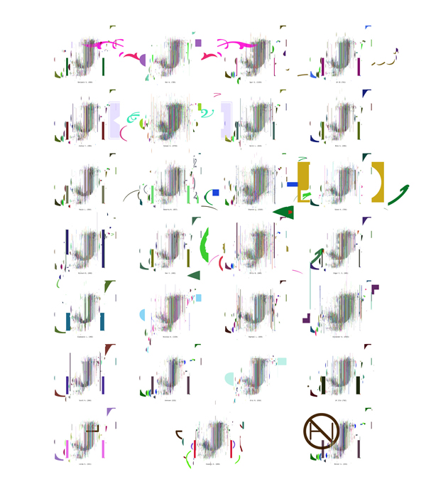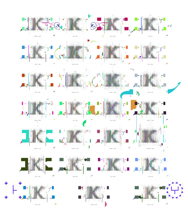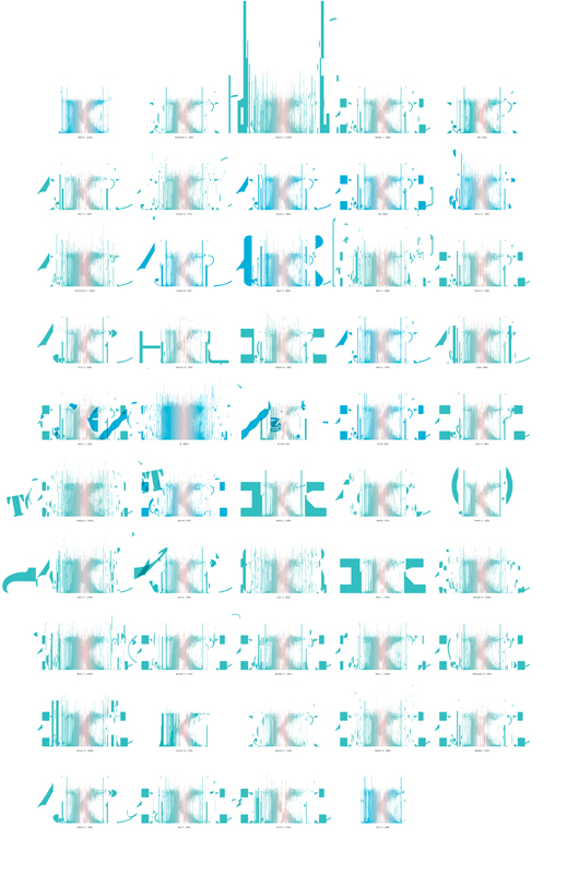 In the first version of the Slitscan script, the bottoms of all the letterforms were aligned and the coloring of the slices gradated from the outside to the inside. In the current version of the script (above), the bottoms of the letterforms are not aligned, but use the font’s baseline position. This gives a better representation of the diversity of type designs. I have also randomized the coloring of the slices.