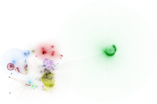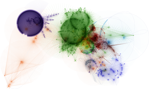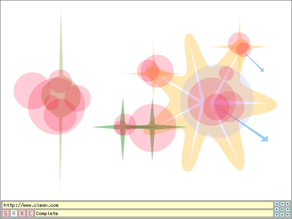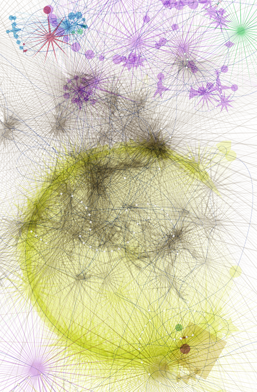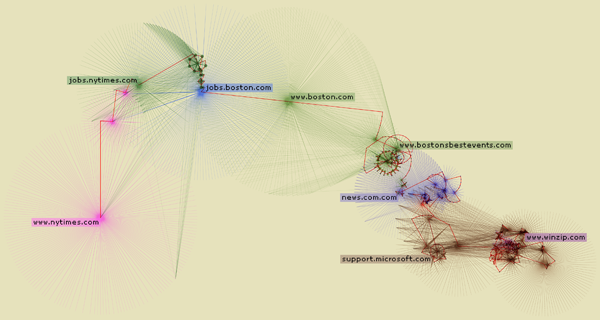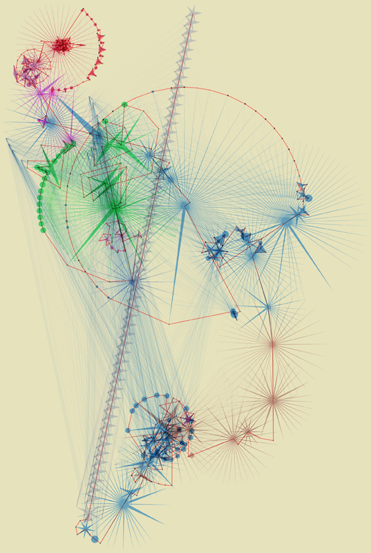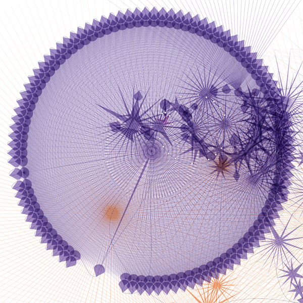 The www.from application traverses and visualizes the interconnected nature of websites it visits. It is a methodical beast that parses the source code of web pages looking for links to other web pages, links within the page itself, email addresses, downloadable files, etc. It creates a star shape with the number of new links found determining the number of spines on the star. Pages that link nowhere new become circles. Email address show as plus-signs. Non-html files are squares.